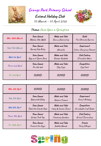 Fill out the form that will be sent to parents or email us at extend@grangeparkprimary.org if the deadline is missed. Please do be careful when booking sessions as we are unable to provide a refund once the bookings are made.