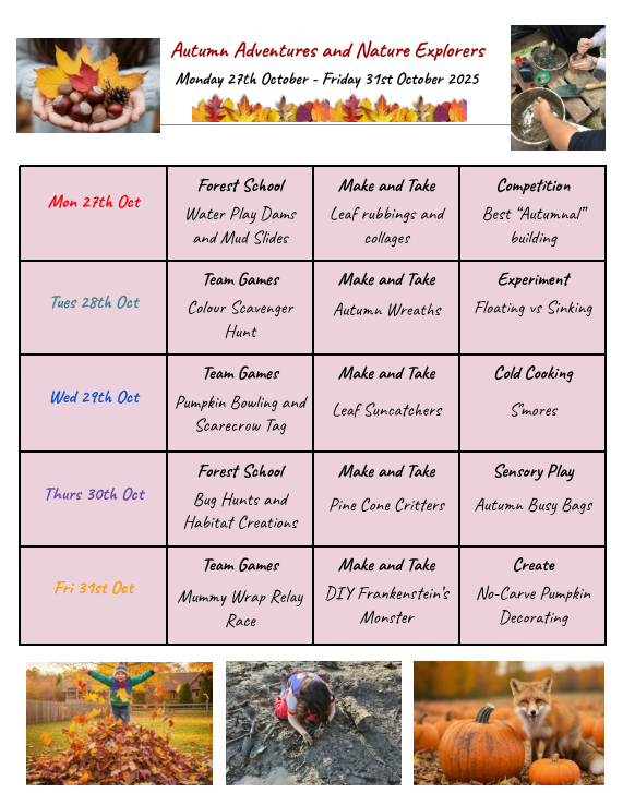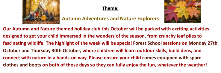 We are planning on providing a holiday club during the October half term from Monday 27th October to Friday 31st October 2025. The cost of the holiday club will be £27.50 per day and the timings will be 8:30am- 6:00pm. Children will need to bring their own snacks and a packed lunch.