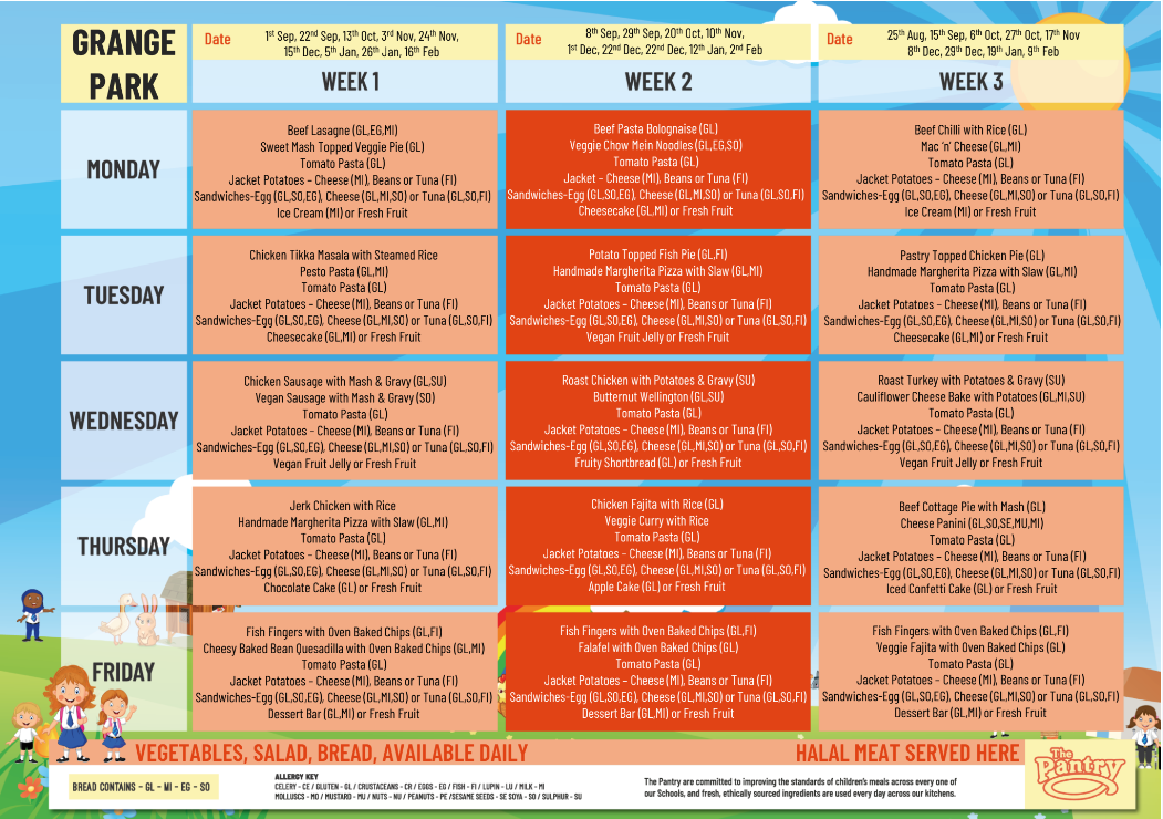 The Pantry, our school meals provider, menus are of a Food for Life Gold standard, which ensures all of The Pantry’s meat, is to a minimum Red Tractor, is Organic where possible and all sourced within the UK. This accreditation also guarantees that your children's meals are freshly cooked on the premises from raw ingredients.